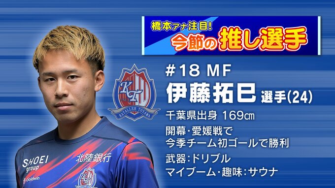 今節の橋本星奈アナウンサーの推し選手は加入3年目のミッドフィルダー、伊藤拓巳選手(24)です。「ウイング」というサイド、前線の左側にいる選手ですが、開幕戦の愛媛戦でも今季チーム初ゴールを決めました。2日の試合も得意のドリブルが光っていました。