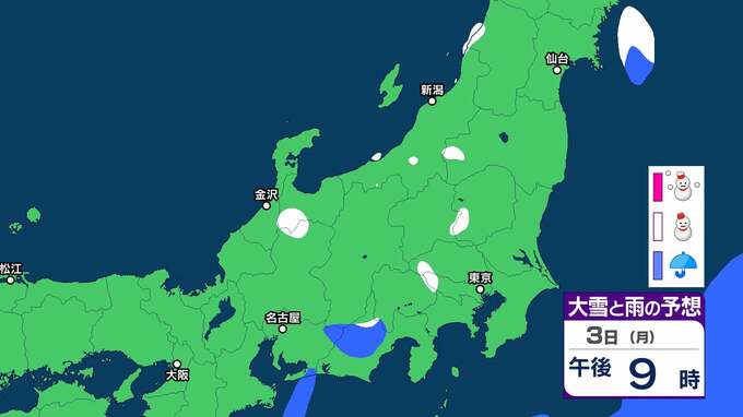 ニュースクリップ 【大雪情報】関東甲信地方は南部の平地でも積雪か 南岸低気圧が4日5日にかけ東海道沖へ 4日夕方まで関東北部1㎝ 箱根から多摩地方や秩父地方にかけて5㎝ 関東南部平地3㎝ 甲信5㎝の降雪予想 積雪や路面凍結による交通障害、着雪やなだれに警戒・注意呼びかけ【雪と雨のシミュレーション】 2025年3月3日(月) 18:55 国内 天気 3日(月)雪と雨のシミュレーション