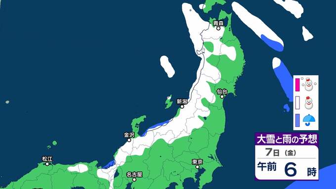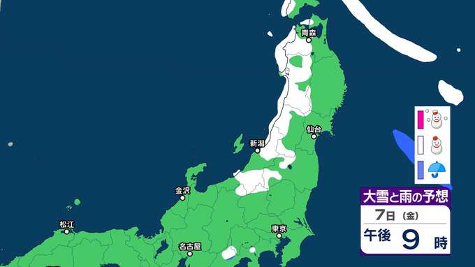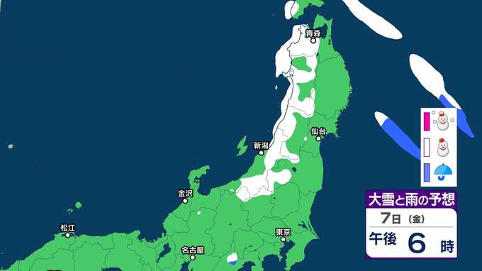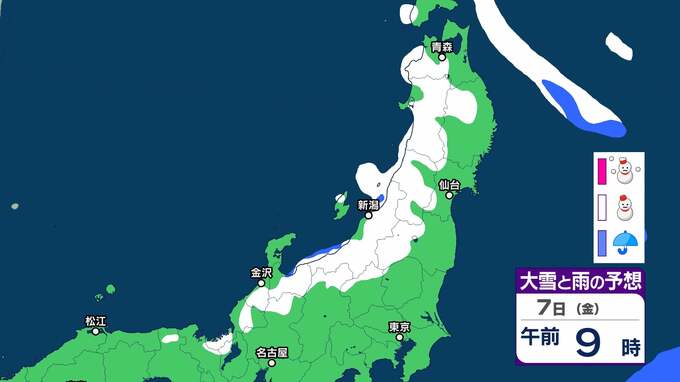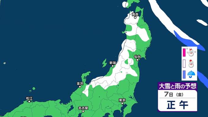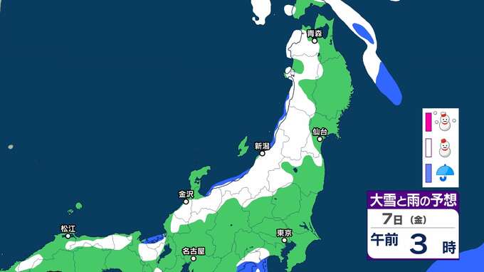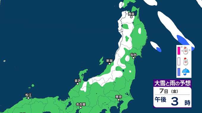 ニュースクリップ 【大雪情報】東北太平洋側は大雪に…警報級の大雪となる可能性も 5日朝まで30センチ 6日朝まで40センチの降雪予想【雪と雨のシミュレーション】大雪による交通障害、屋根からの落雪、建物や農業施設への被害に注意・警戒を 2025年3月4日(火) 10:00 国内 天気 7日(金)雪と雨のシミュレーション