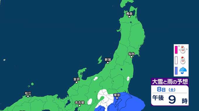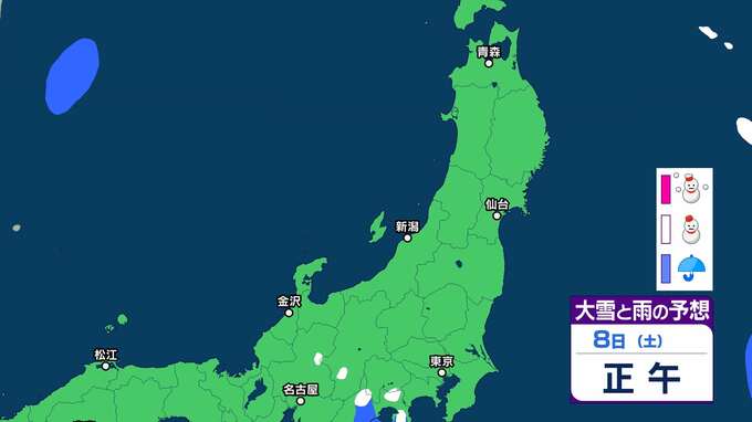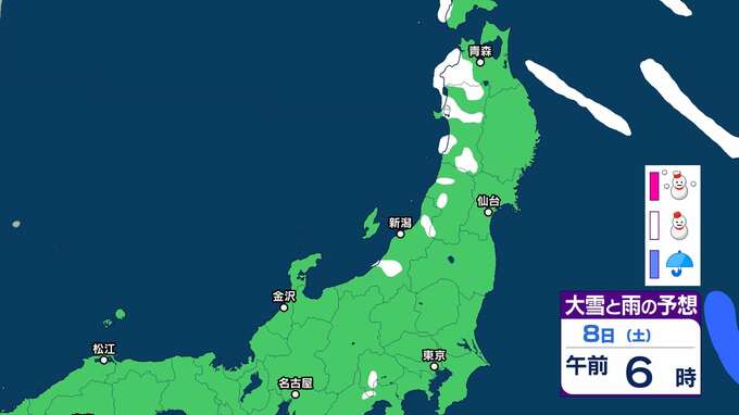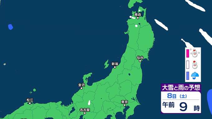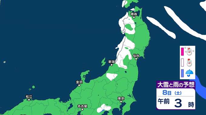 ニュースクリップ 【大雪情報】東北太平洋側は大雪に…警報級の大雪となる可能性も 5日朝まで30センチ 6日朝まで40センチの降雪予想【雪と雨のシミュレーション】大雪による交通障害、屋根からの落雪、建物や農業施設への被害に注意・警戒を 2025年3月4日(火) 10:00 国内 天気 8日(土)大雪と雨のシミュレーション