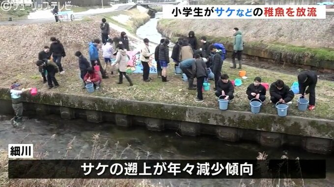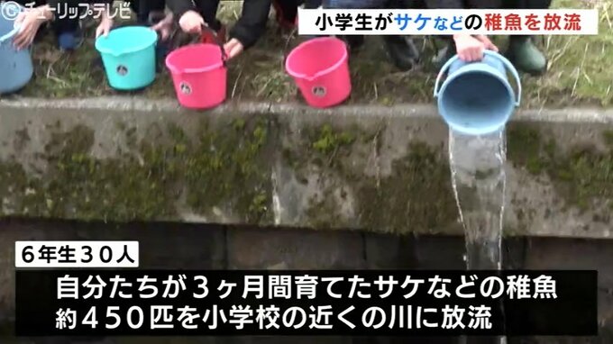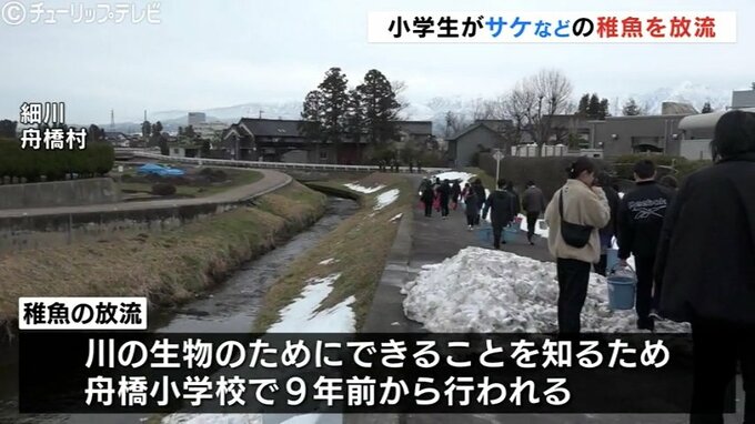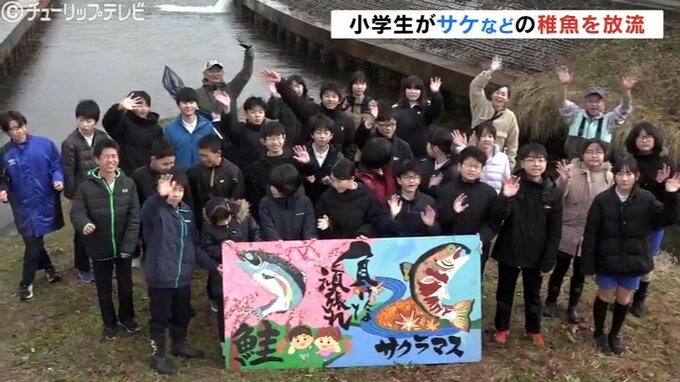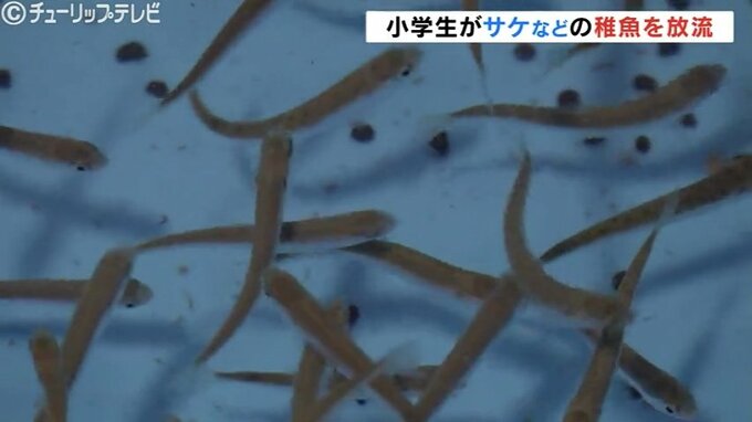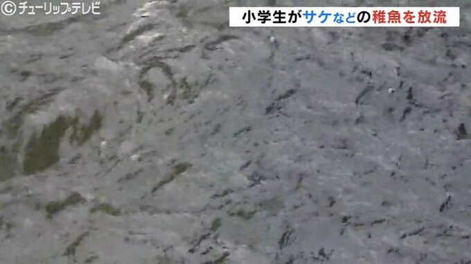地元の生き物に親しみを持ち環境の大切さを学んでもらうと4日、富山県舟橋村の小学生がサケやサクラマスの稚魚を放流しました。