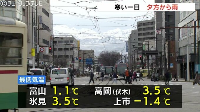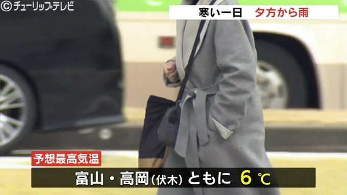 このあとの県内は夕方から雨となる予想で日中の最高気温は富山・高岡市の伏木ともに6℃と寒い一日となりそうです。