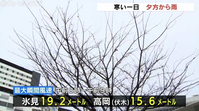 また県西部を中心に朝方にかけて北東の風が強く吹き最大瞬間風速は氷見で19.2メートル高岡市の伏木で15.6メートルとなっています。