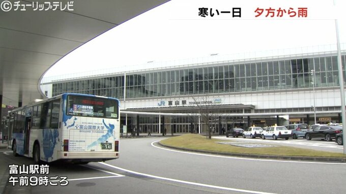富山県内は低気圧の影響を受け、あさからおおむね曇りとなっています。朝の最低気温は富山で1.1℃、高岡市伏木で3・5℃と平年より高めの気温となりましたが富山駅前ではコートやマフラーで厚着をして足早に歩く人の姿が目立ちました。