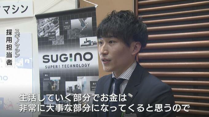会場には、初任給や基本給の引き上げに踏み切る企業も…。滑川市の製造業・スギノマシンは、4年連続で、初任給を引き上げました。
