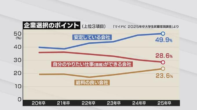 マイナビによりますと、企業選択のポイントとして「やりたい仕事ができる会社」が年々減少傾向にある一方、「安定している会社」が6年連続でトップに輝き、「給料の良い会社」も3年連続で増加しているということです。