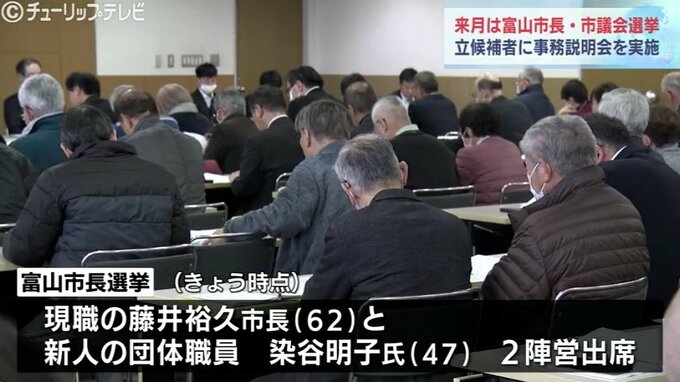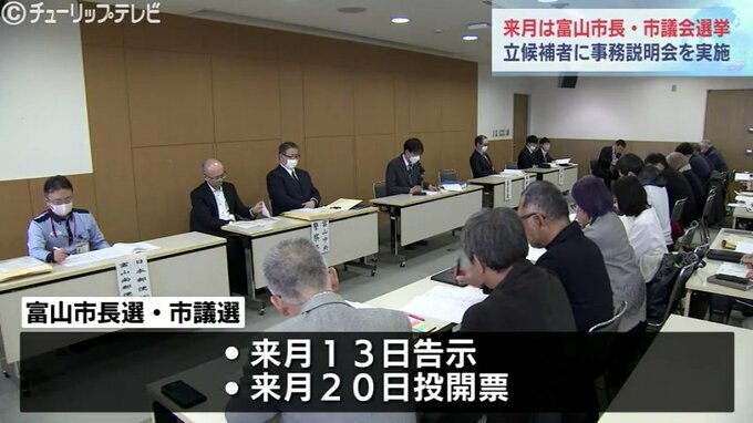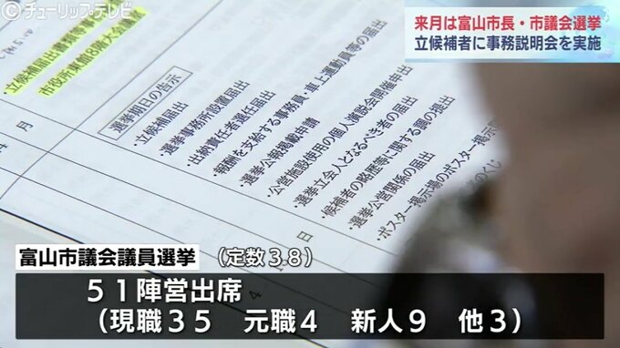 説明会には、富山市長選・市議選に出馬予定の関係者らが出席し、立候補手続きなどの説明を受けました。