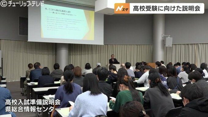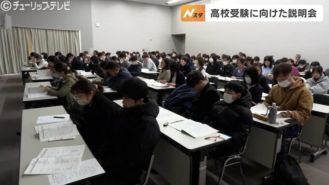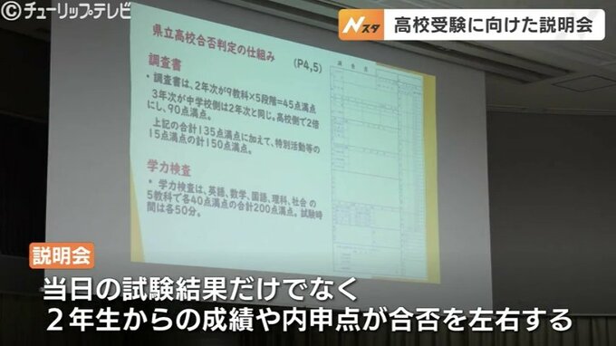 説明会では来年度の高校入試は公立高校と私立高校の入学定員割合「公私比率」が撤廃され、県立高校の倍率が変わる可能性があることや、高校入試は当日の試験結果だけでなく、2年生からの成績や内申点が合否を大きく左右することなどが説明されました。