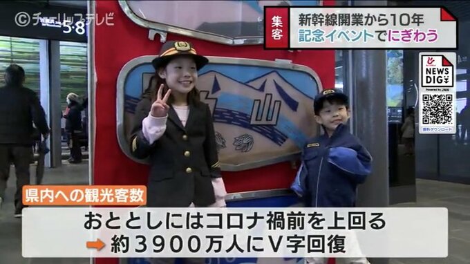 新幹線開業後、年間3500万人前後で推移していた県内への観光客数は、コロナ禍でいったん落ち込みましたが、2023年にはコロナ禍前を上回るおよそ3900万人にV字回復し、今後さらなる観光への効果が期待されます。