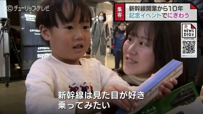 このうち富山駅では記念イベントとして、北陸新幹線と同じ年齢の10歳と1歳の子どもたちが描いた作品を車内に展示した特別列車が運行されました。