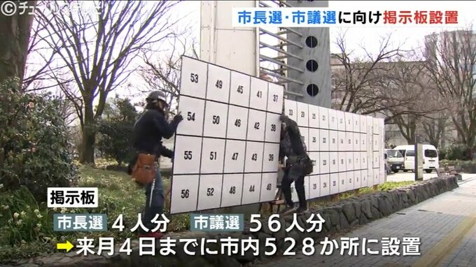 用意された掲示板は市長選が前回の選挙から4人減って4人分、市議選は前回と変わらず56人分のポスターを掲示することができ、4月4日までに市内528か所に設置されます。