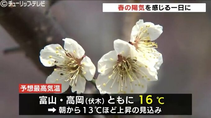 21日の富山県内は朝から晴れて日差しが届き、同日午後は朝より気温が13℃ほど上がり春の陽気を感じられそうです。