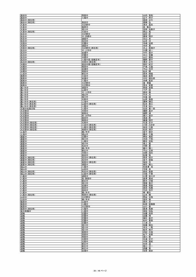ニュースクリップ あの先生どこ行くがけ?富山県 教職員人事異動 2025【中学校教諭】令和7年・名簿掲載 2025年3月24日(月) 18:13 国内 暮らし・マネー 富山県教育委員会は24日、一般教員および事務局職員の異動を発表しました。一般教員の異動総人数は1877人です。内訳は教頭174人、教諭・養護教諭・栄養教諭が1585人、事務局職員・学校栄養職員が118人です。 中学校教諭(魚津・富山地区)