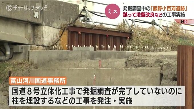 国交省が富山市で進めている国道8号の立体化工事で、富山河川国道事務所が遺跡の発掘調査が完了してないのに工事を発注し、実施していたことがわかりました。