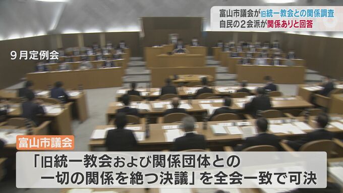 旧統一教会との関係断絶へ向けた動きで、富山市議会は会派ごとに旧統一教会との関係を調査してきました。17日は提出期限を迎えましたが現時点で8つの会派すべてが調査結果を議長に提出し、そのうち2つの会派が関係があったと回答しています。