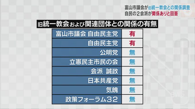 17日は提出期限を迎え8つの会派すべてが回答し、チューリップテレビの調べではそのうち「富山市議会自由民主党」と「自由民主党」の2つの会派が旧統一教会との関係を認めています。