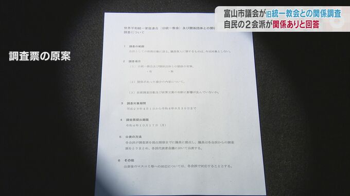 富山市議会が実施した旧統一教会や関係団体との関係を調べる調査票。