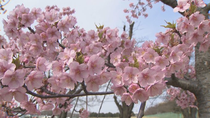 富山市の三菱ケミカル富山事業所には約35本のカワヅザクラが植えられていて、25日に開花し、見ごろを迎えています。