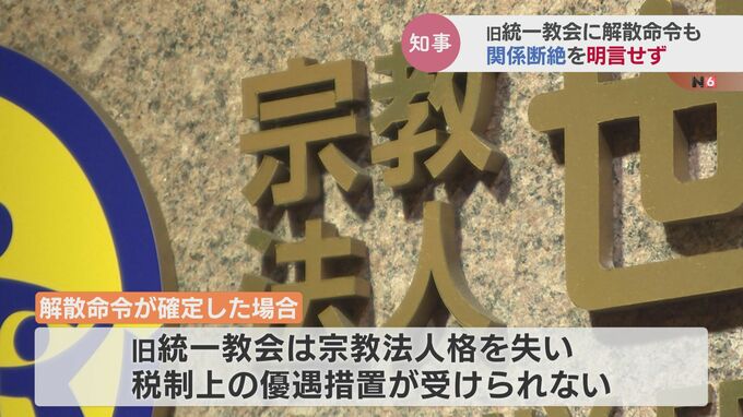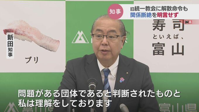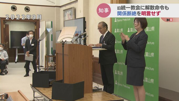 政教分離の原則を理由に旧統一教会と関係断絶を明言していない富山県の新田八朗知事は27日、たとえ教団が法人格を失っても宗教団体には変わりはないとして、関係断絶を明言しませんでした。コンプライアンスに問題がある団体とは付き合わないが断絶ではないとしています。