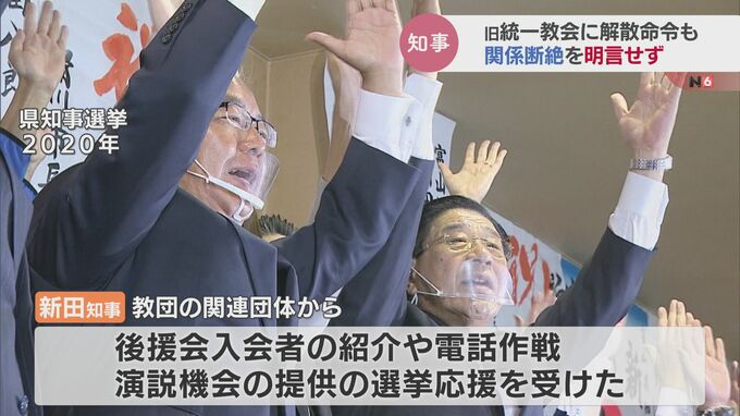 新田知事は初当選を果たした2020年の県知事選挙で当時の教団トップと面会。
