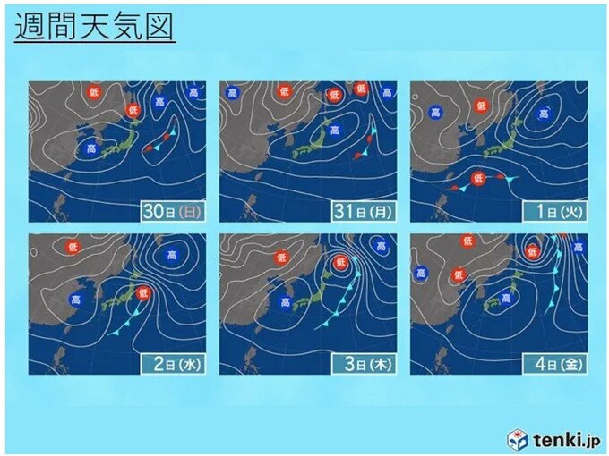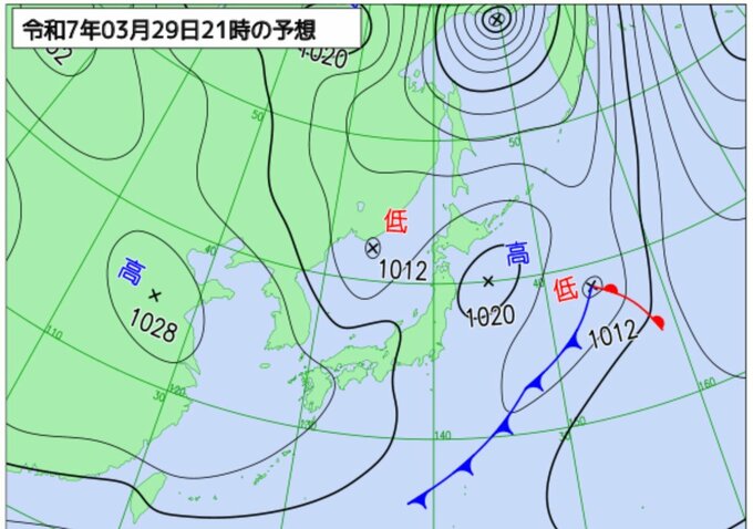 29日(土)は全国的に冷たい空気に包まれ、関東の最高気温は10℃に届かない見込みです。30日(日)も気温の上がり方は鈍く、桜が咲いている所は花冷えです。4月1日(火)頃まで平年より気温の低い状態が続き、来週後半は春らしい暖かさとなる見込みです。