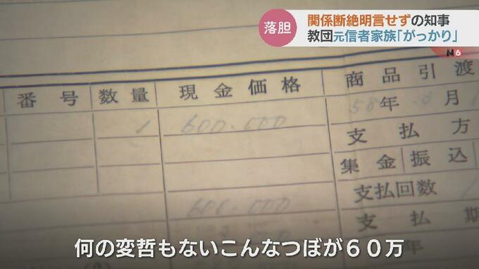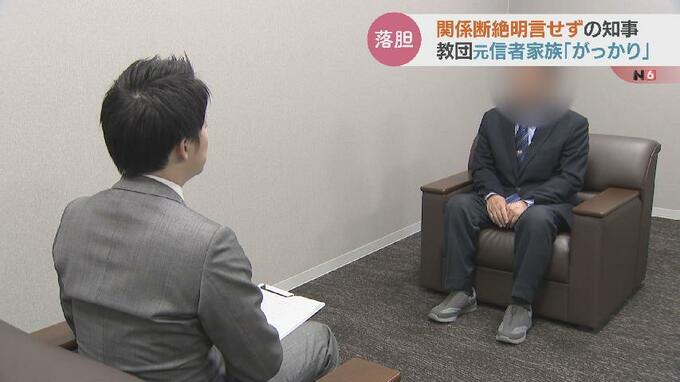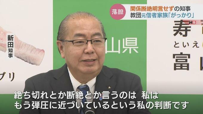 解散命令が出された旧統一教会に対し、新田知事は27日の定例会見で、政教分離の原則を理由に関係断絶を明言しない姿勢を変えませんでした。知事の発言内容を知った元信者の家族は、“知事が教団の広告塔のようで、被害者を切り捨てている” と語りました。