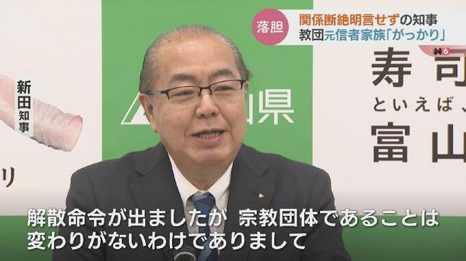 新田知事は27日、旧統一教会はコンプライアンス上問題のある団体であり、今後は一切関わらないとした上で、政教分離の原則を理由に関係断絶という強い言葉は遣えないとしました。