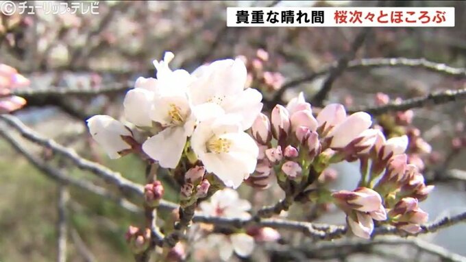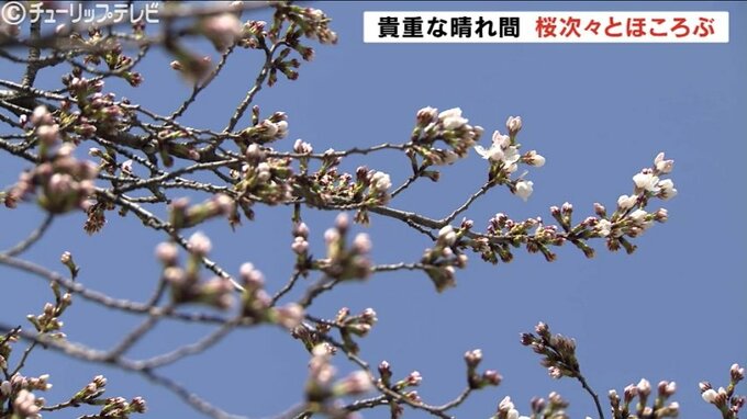 29日の富山県内は朝頃まで雨が残った所もありますが次第に止んで晴れています。富山市のサクラの名所、松川べりでは、青空の下、桜のつぼみが次々とほころび始めています。