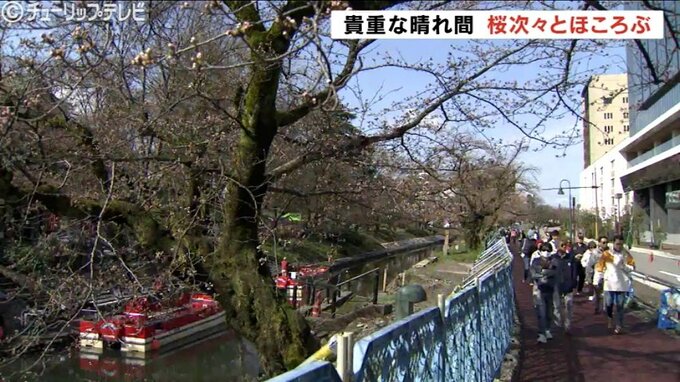 29日の富山県内は高気圧に覆われて、広い範囲で晴れとなっています。富山市の松川べりでは、ほころび始めた桜に立ち止まり、写真に収める人の姿が見られました。