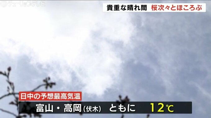 このあともおおむね晴れて、日中の予想最高気温は、富山・高岡市の伏木ともに12℃と3月中旬並みと肌寒い一日となる見込みです。