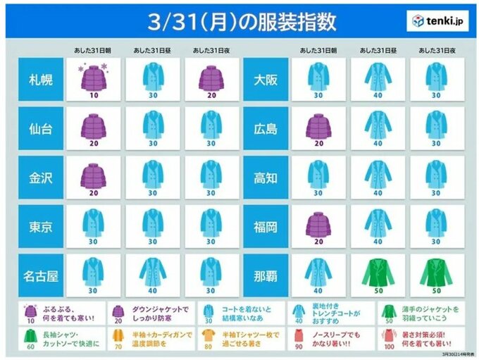 朝の最低気温は前日より低くなり、九州から関東でも5℃以下の予想です。朝の通勤は冬のコートや手袋が欲しくなるくらいでしょう。福岡は3℃と真冬並みで、ダウンコートが役立ちそうです。