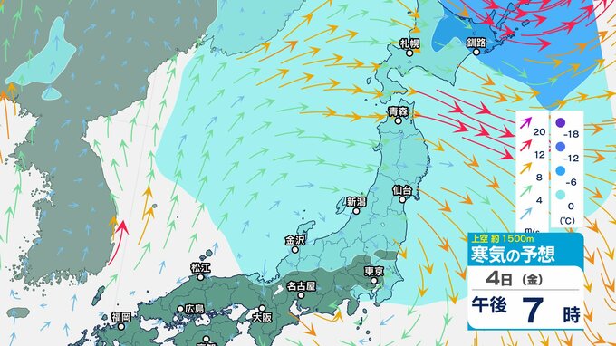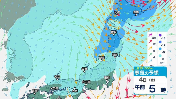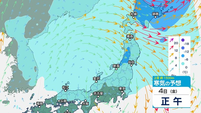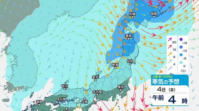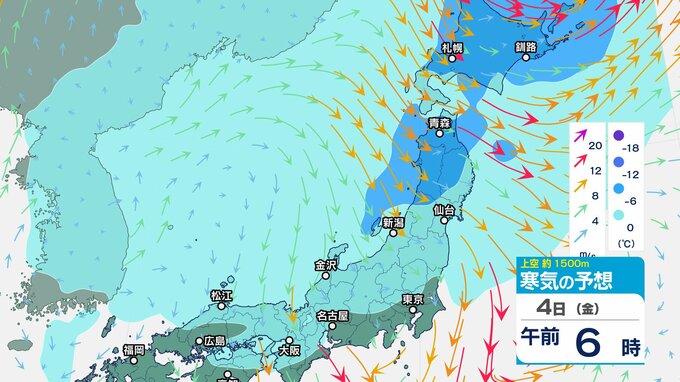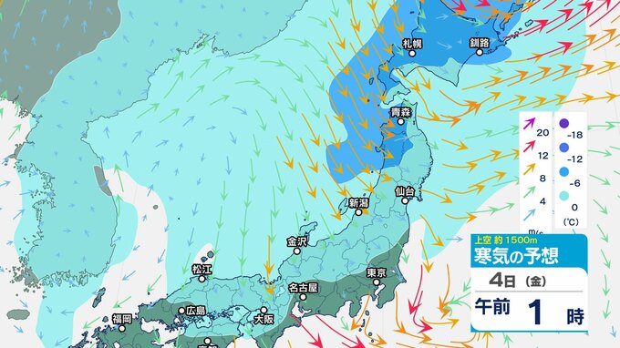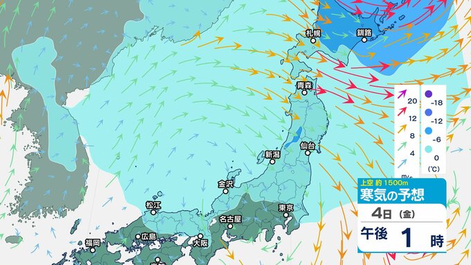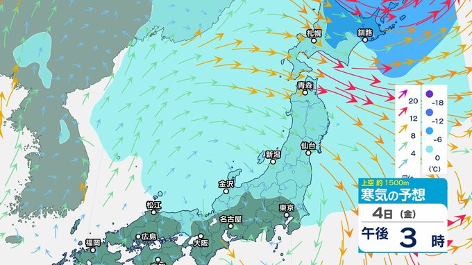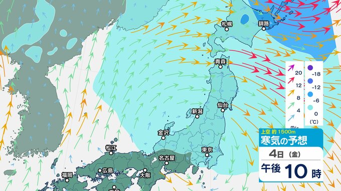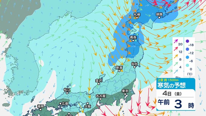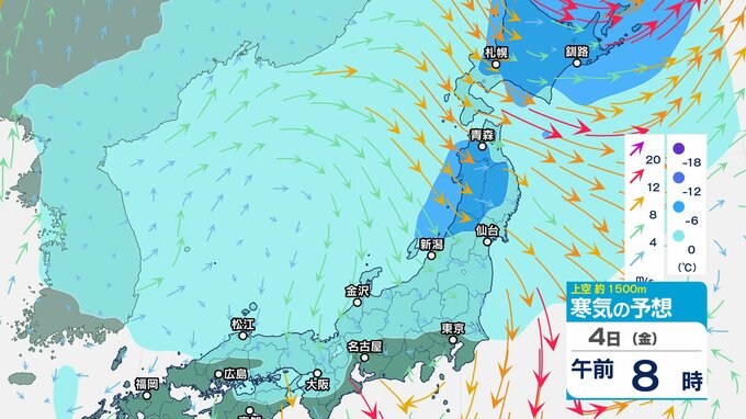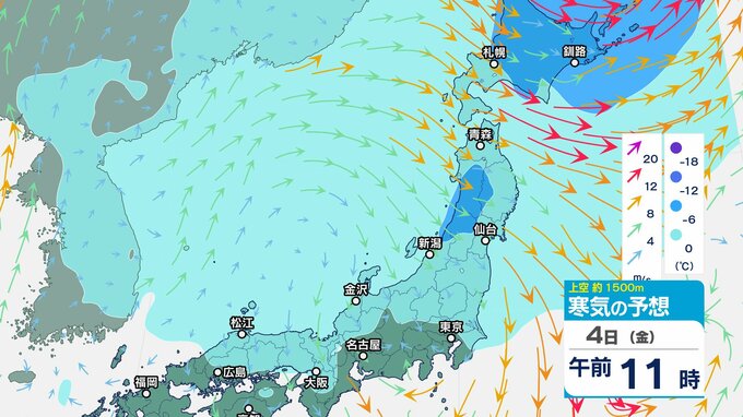 ニュースクリップ 低気圧が発達しながら北東へ 関東地方は大雨の峠越えるも土砂災害に注意 うねり伴いしける見込み【寒気のシミュレーション】 2025年4月3日(木) 08:35 国内 天気 4日(金)上空の寒気シミュレーション