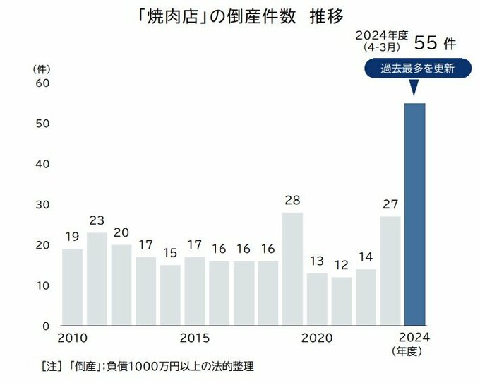 帝国データバンクによりますと、2024年度の焼肉店の負債額1000万円以上の法的整理は55件で、前の年度の27件から倍増、過去最多の件数を更新しました。個人営業などの小規模店の閉店や廃業を含めれば、さらに多くの焼肉店が市場から退出したとみられます。