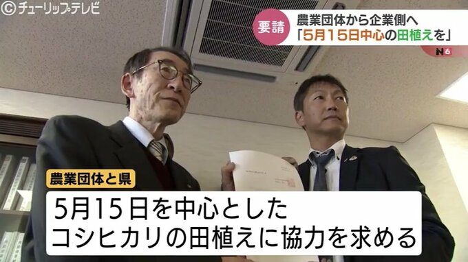 田植えは5月15日に 農業団体らが企業側へ協力要請 猛暑で胴割米増加 温暖化に対応した産地への転換を 富山 2025年4月4日(金) 19:50 国内 温暖化に対応したコメ産地への転換を推進しようと、富山県内の農業団体らが企業側へ5月15日を中心としたコシヒカリの田植えに協力を要請しました。県商工会議所連合会を訪れたのは県農業協同組合中央部会の豊川和…