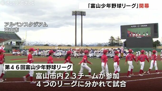富山少年野球リーグには、富山市内の23チームが参加。4つのリーグに分かれて熱戦を繰り広げます。