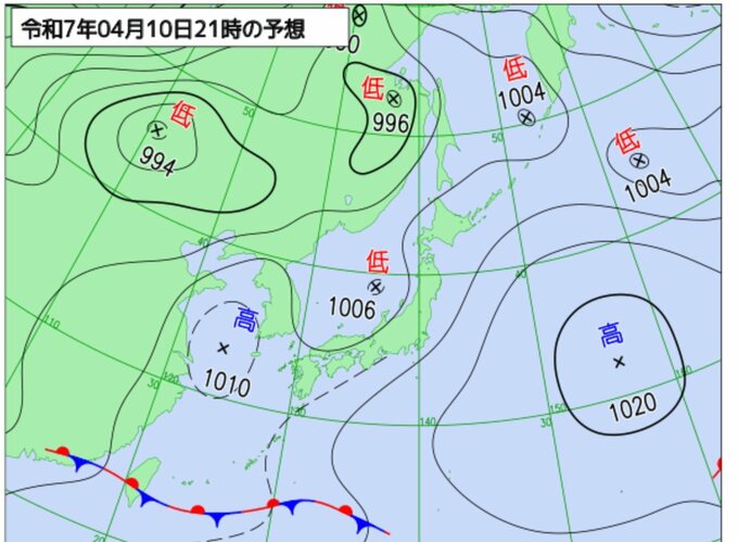 また10日は、前線が東シナ海から南西諸島にかけてのび、南西諸島では、前線に向かって高気圧の縁を回る暖かく湿った空気が流れ込む見込みです。
