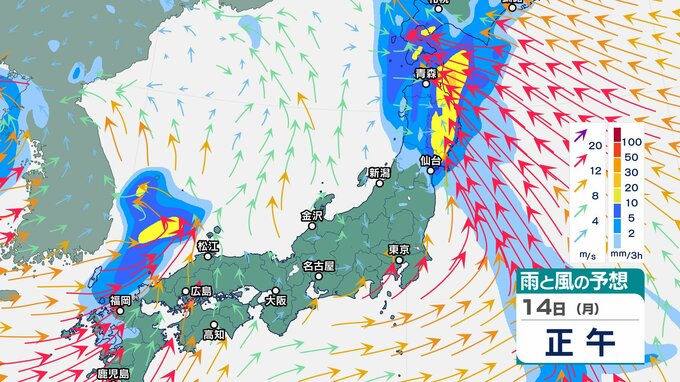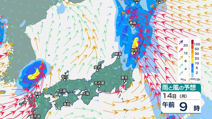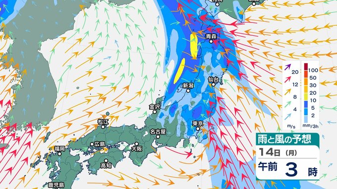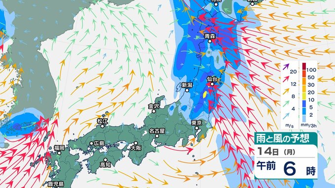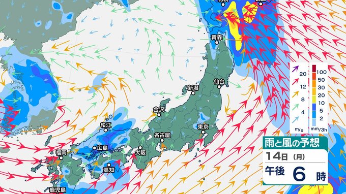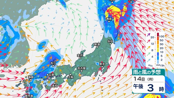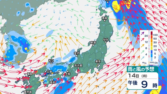 ニュースクリップ 14日昼過ぎから大気の状態が非常に不安定 【嵐の使者】気象台は落雷や竜巻などの激しい突風、ひょう、急な強い雨に注意呼びかけ【雨と風シミュレーション】上空5500メートルに氷点下30℃以下の寒気 2025年4月13日(日) 17:33 国内 天気 14日(月)雨と風のシミュレーション