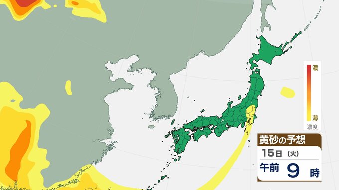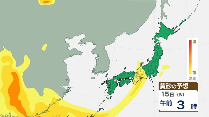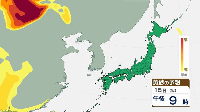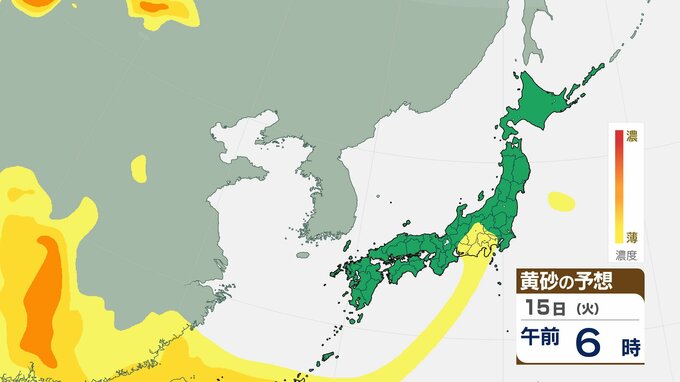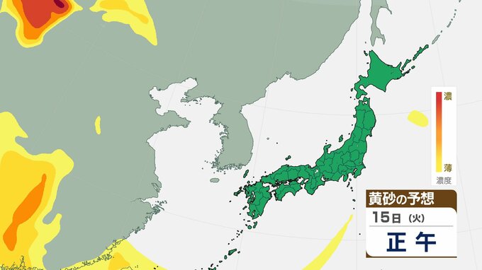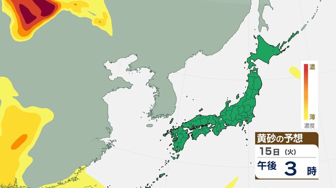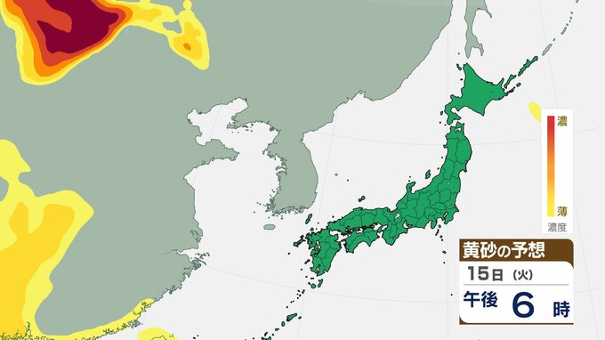 ニュースクリップ “黄砂” 飛来…南西諸島から西日本の広い範囲【黄砂に関する全般気象情報】気象台は視程5キロ未満で交通障害への注意呼びかけ【飛来のシミュレーション】所によっては視程が5キロメートル未満となる見込み 2025年4月14日(月) 16:20 国内 天気 15日(火)黄砂の動きシミュレーション