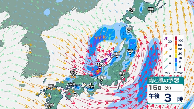 ニュースクリップ 発達した低気圧が北陸に接近 上空5500メートルに氷点下30℃以下の強い寒気【雨と風シミュレーション】15日夜遅くにかけ落雷や竜巻などの激しい突風に注意 2025年4月15日(火) 08:27 国内 天気 15日(火)雨と風のシミュレーション