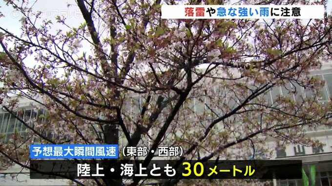 その影響で県内は雨とともに風が強まり、予想される最大瞬間風速は東部・西部ともに海上と陸上で30メートルとなっています。