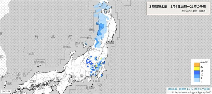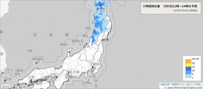 東北地方 竜巻や落雷などに注意 5日明け方にかけて 大気の状態が不安定に 仙台管区気象台 2025年5月4日(日) 17:10 国内 天気 3時間ごとの予想降水量(4日) 画像はいずれも気象庁HPより(4日午前11時発表)