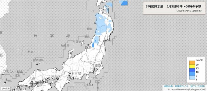東北地方 竜巻や落雷などに注意 5日明け方にかけて 大気の状態が不安定に 仙台管区気象台 2025年5月4日(日) 17:10 国内 天気 3時間ごとの予想降水量(5日午前6時まで) 画像はいずれも気象庁HPより(4日午前11時発表)