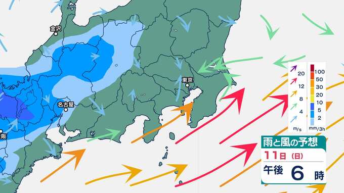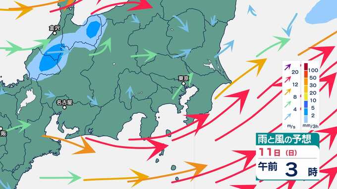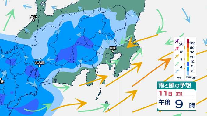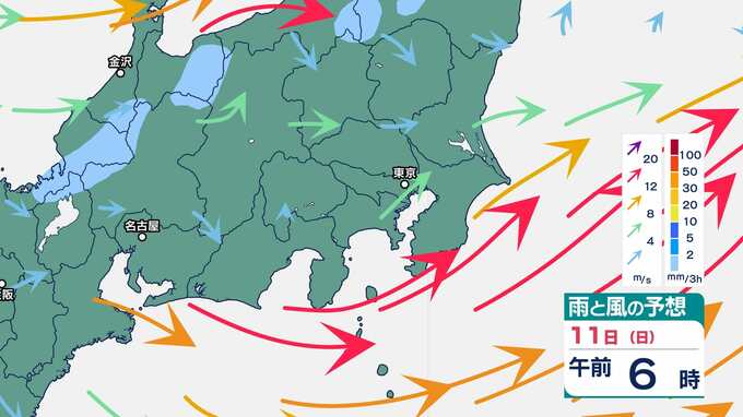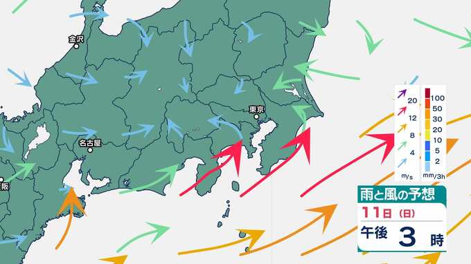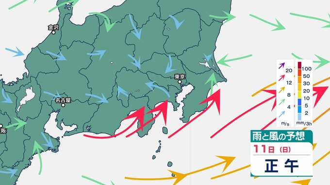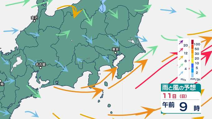 【気象情報】関東地方南部と伊豆諸島は、10日、激しい雨が降り大雨となるおそれ 関東地方南部100ミリ・伊豆諸島120ミリ(9日午後6時から24時間予想降水量)土砂災害、低い土地の浸水、河川の増水に注意・警戒を 2025年5月8日(木) 16:50 国内 暮らし・マネー 11日(日)の雨と風のシミュレーション