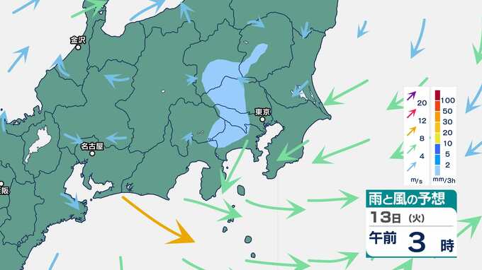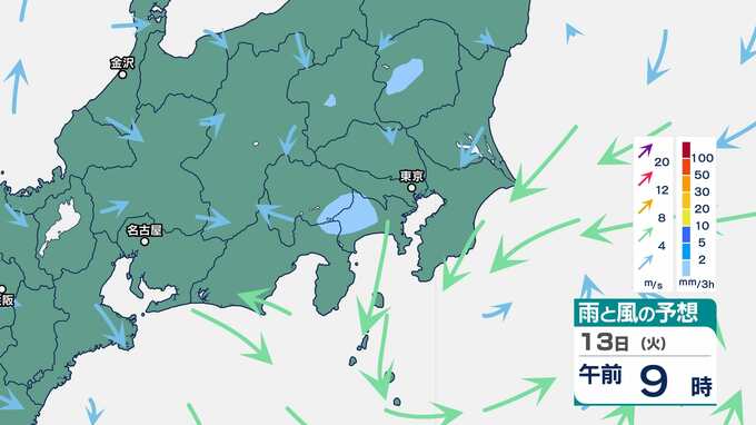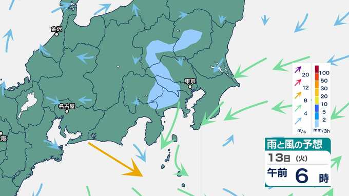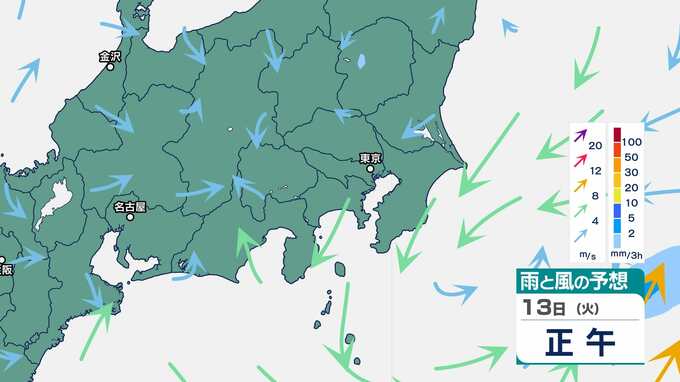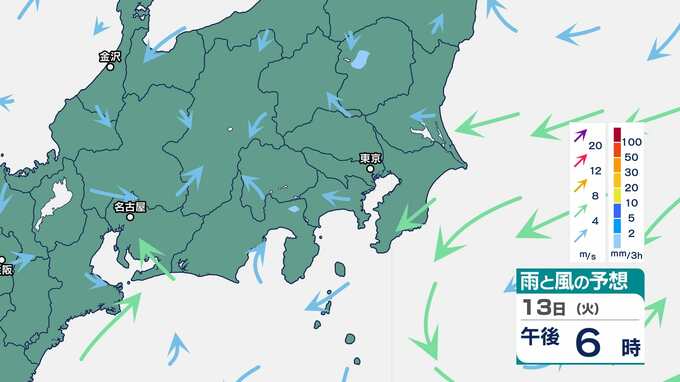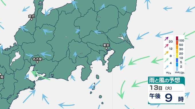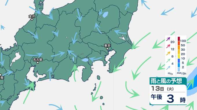 【気象情報】関東地方南部と伊豆諸島は、10日、激しい雨が降り大雨となるおそれ 関東地方南部100ミリ・伊豆諸島120ミリ(9日午後6時から24時間予想降水量)土砂災害、低い土地の浸水、河川の増水に注意・警戒を 2025年5月8日(木) 16:50 国内 暮らし・マネー 13日(火)の雨と風のシミュレーション
