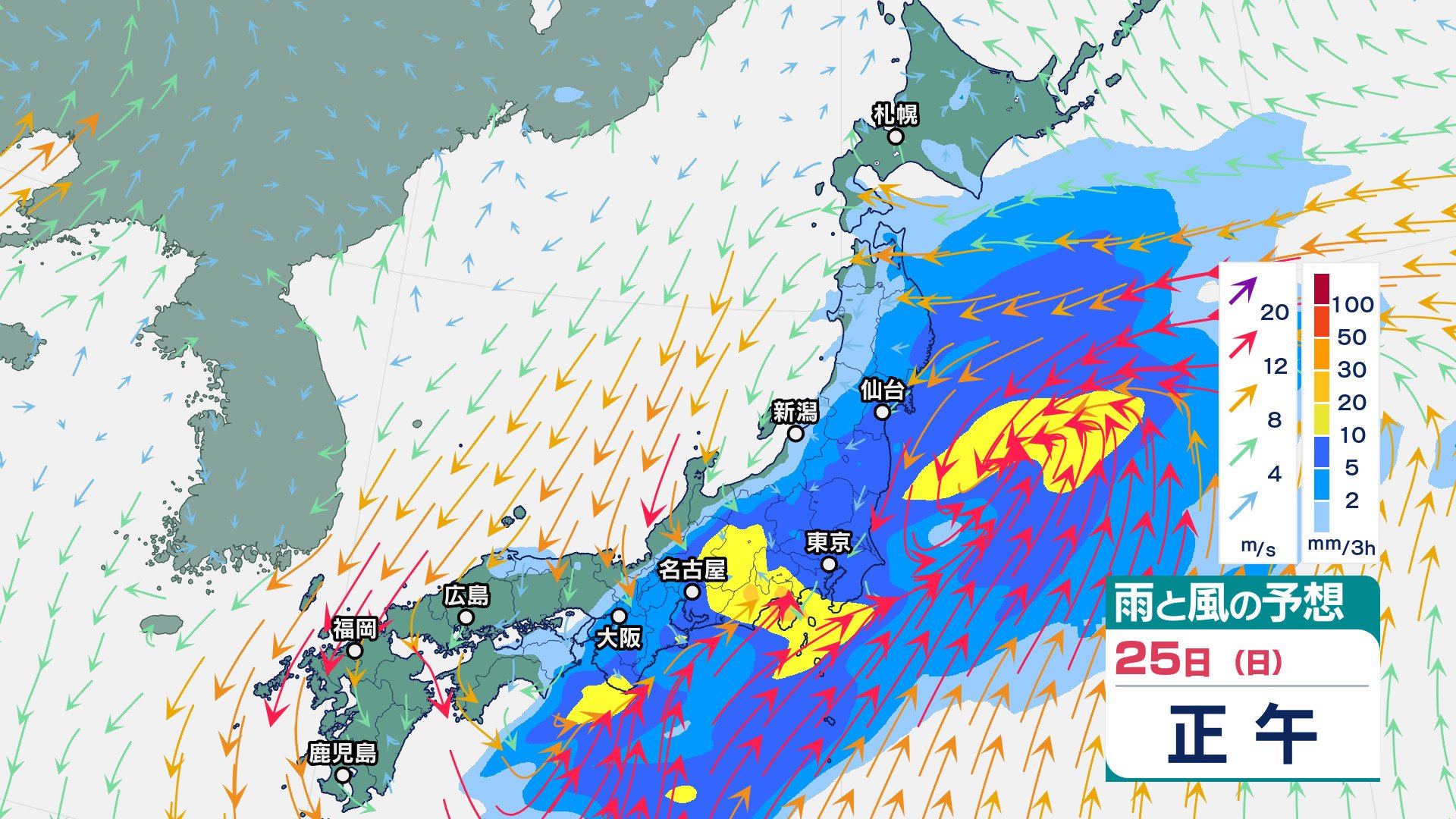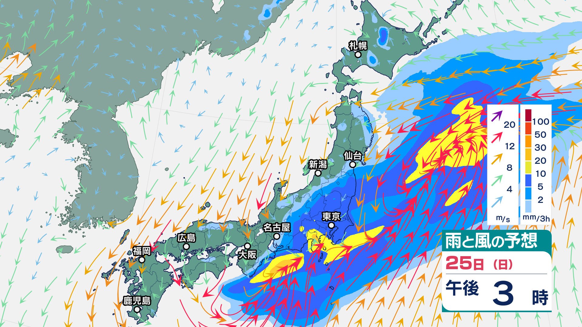 ニュースクリップ 23日にかけ前線南下、南西諸島付近で停滞…大気の状態は非常に不安定 南西諸島と西日本から東日本は土砂災害や低地の浸水、河川の増水に注意【雨と風のシミュレーション】落雷や突風、ひょう、局地的に竜巻などに警戒 2025年5月22日(木) 07:07 国内 天気 25日(日)雨と風のシミュレーション