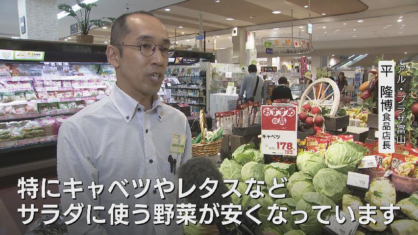 「全体的に値段が下がっていまして、特にキャベツやレタスなどサラダに使う野菜が安くなっています」