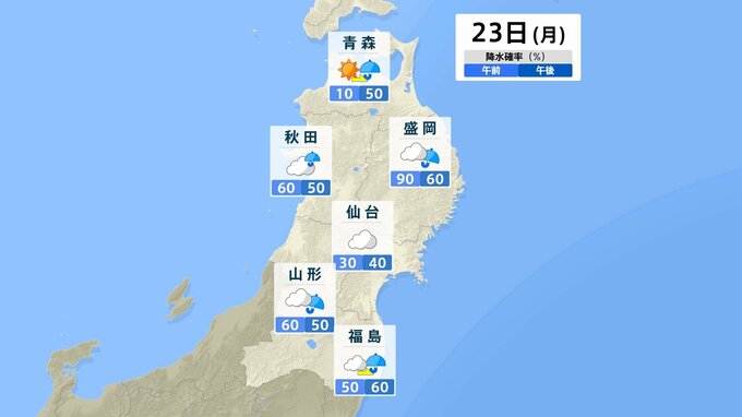 東北日本海側北部では前線や暖かく湿った空気の影響により、23日昼前にかけて大雨となるところがあるでしょう。気象台は土砂災害や低い土地の浸水、河川の増水に注意・警戒するよう呼びかけています。また、東北地方では23日昼前から夜遅くにかけて、大気の状態が非常に不安定となる見込みです。竜巻などの激しい突風や落雷、ひょうに注意してください。