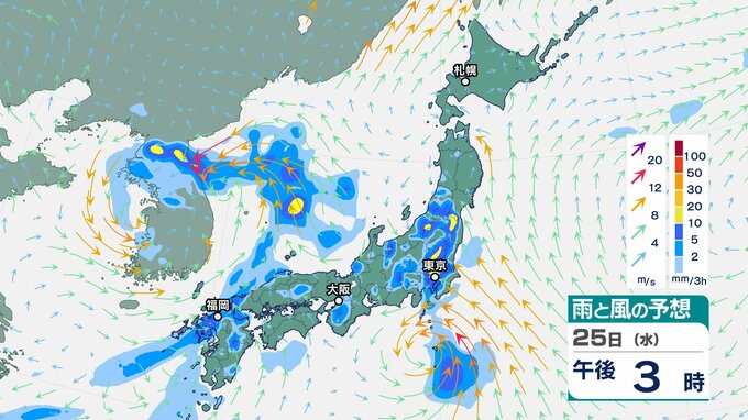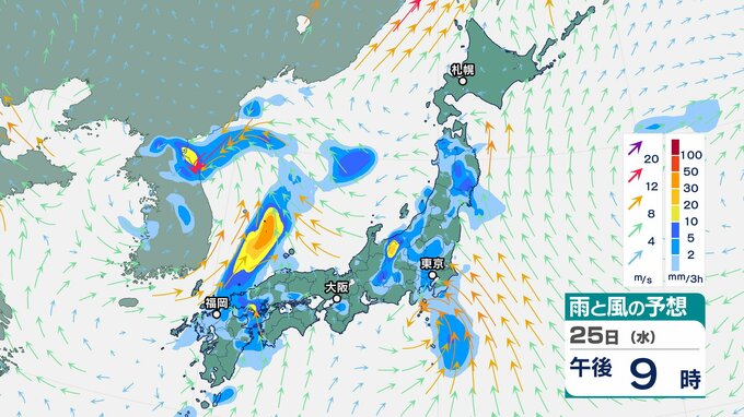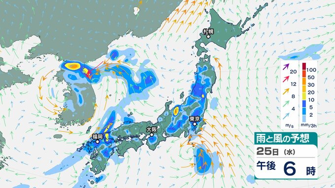 ニュースクリップ “梅雨前線” と複数の “低気圧” さらに台風から変わった “熱帯低気圧” が複雑に影響…25日は大雨と強風、北日本では落雷にも警戒【雨と風のシミュレーション】西日本から北日本にかけて大雨に警戒 土砂災害や河川増水に注意 2025年6月25日(水) 08:43 国内 天気 25日(水)雨と風のシミュレーション