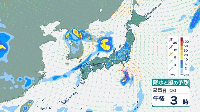ニュースクリップ 関東地方・伊豆諸島 “警報級”大雨の可能性 多いところで1時間に40mm予想 土砂災害や浸水に警戒を【雨風シミュレーション】熱帯低気圧の影響 2025年6月25日(水) 09:24 国内 天気 25日(水)の雨風シミュレーション