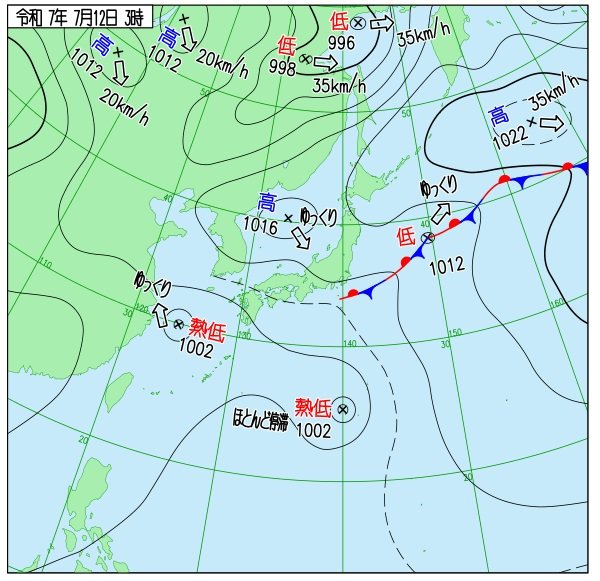 気象庁によりますと、12日3時の観測によると、熱帯低気圧が小笠原近海にあって、ほとんど停滞しています。中心の気圧は1002ヘクトパスカル、中心付近の最大風速は15メートル、最大瞬間風速は23メートルとなっています。